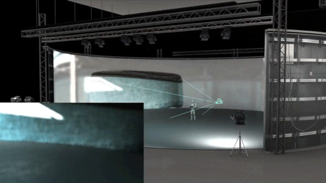 走进虚拍基地,一大一小弧形巨幕映入眼帘。基地包括两个拍摄影棚及附属配套用房: